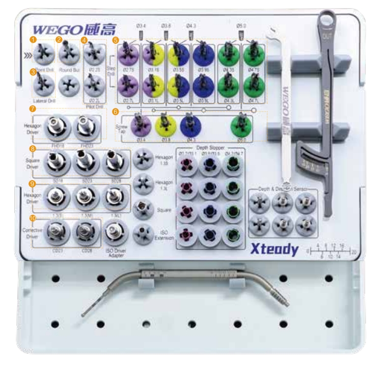 本套器械為Xteady牙種植體系統(tǒng)專用外科種植手術器械,采用顏色標記的設計,讓手術流程一目了然;整套器械由瑞士專業(yè)牙科工具供應商制造,加工精良,設計合理,精確耐用;滅菌盒可反復高溫壓力滅菌,便于清洗,內(nèi)置配件盒,方便器械滅菌與使用。